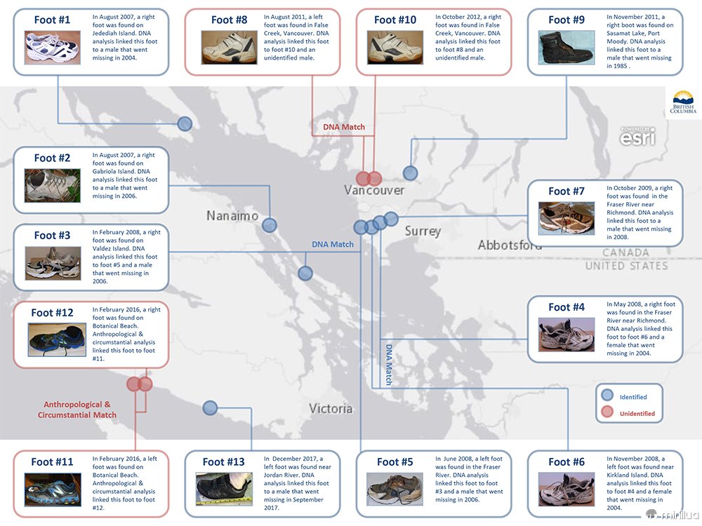 Seis dias depois, a poucos quilômetros dali, na Ilha Gabriola, um casal encontra outro tênis. Outro pé. A notícia se espalha como um incêndio, dando início a um dos mistérios mais fascinantes e arrepiantes do nosso tempo. Nos doze anos seguintes, um total de 21 pés humanos, a maioria calçando tênis modernos, seriam devolvidos pelo mar às praias do Mar de Salish, uma vasta rede de canais que se estende entre o Canadá e os Estados Unidos.