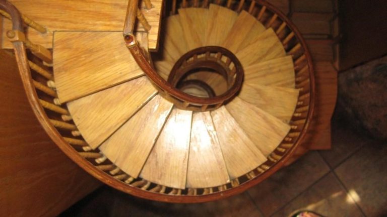 - A Construção Impossível: A escada não possui um pilar de suporte central (newel), que é o elemento estrutural padrão para dar estabilidade a uma escada em espiral. Ela se sustenta como que por magia. Além disso, foi construída sem um único prego ou cola; apenas cavilhas de madeira unem as peças com uma precisão desconcertante. Como ela suporta o peso e permanece de pé há mais de um século é uma questão que desafia as explicações convencionais da física. Análises modernas sugerem que o raio interno da espiral é tão apertado que a longarina interna age como um suporte “virtual”, e a laminação das peças de madeira cria uma estrutura mais forte que a madeira maciça. Mesmo assim, um estudo de engenharia concluiu que a escada está sob um estresse severo, operando no limite de sua resistência material. Originalmente, ela não tinha corrimão e balançava ao ser usada, o que levou à adição posterior de um corrimão e um pequeno suporte de ferro que a conecta a uma coluna próxima, uma concessão à segurança que pouco faz para resolver o mistério original de seu equilíbrio.