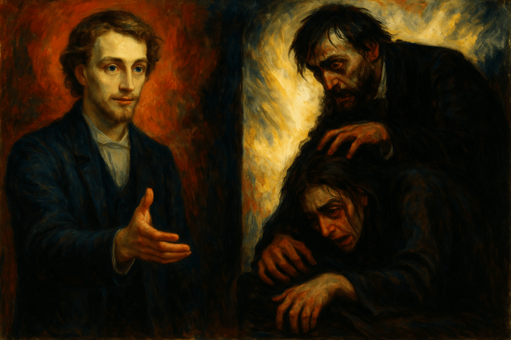 A Forma Pura que Dostoiévski busca aqui é a do Amor Ágape — o amor incondicional, sacrificial, que não pede nada em troca. Míchkin é a tentativa de esculpir um Cristo para o século XIX, não um Cristo que opera milagres, mas um que vive e respira entre os homens, expondo a hipocrisia deles com sua mera presença. Ele ama Nastássia não por sua beleza, mas por seu sofrimento. Ele perdoa Rogójin não por ingenuidade, mas por enxergar, sob as camadas de fúria, um irmão em desespero.