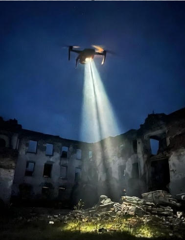 3.Projeção: Programei meus drones para voarem em formação pelos corredores. Eles não só emitiam esse coro traduzido, mas também projetavam nas paredes as fotos e os nomes das vítimas que a Dra. Moraes nos forneceu.