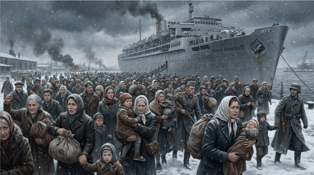 Assim começou a Operação Aníbal, a maior evacuação marítima da história, superando em muito a famosa retirada de Dunquerque. Milhares de pessoas, a maioria civis – mulheres, crianças, idosos – correram para os portos do Báltico, enfrentando um frio cortante e o caos da guerra. O Wilhelm Gustloff, o antigo navio de lazer, tornou-se uma arca de Noé desesperada.