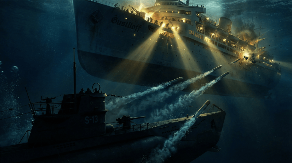 Às 21h16, o inferno começou. Três dos quatro torpedos atingiram o Gustloff em cheio. O primeiro acertou a proa, onde ficavam os alojamentos da tripulação, matando instantaneamente aqueles que melhor saberiam organizar uma evacuação. O segundo explodiu na área da piscina, aniquilando centenas de enfermeiras e feridos. O terceiro atingiu a casa de máquinas, silenciando os motores e mergulhando o navio na escuridão total.