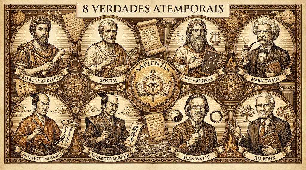 Essas oito verdades, apesar de terem nascido em contextos tão distintos — do Império Romano em crise moral ao Japão feudal dos samurais, da Grécia antiga à América do século XX —, compartilham uma percepção quase desconfortavelmente precisa sobre a condição humana: nosso maior inimigo raramente vem de fora, mas da maneira como habitamos nossa própria mente. Marco Aurélio escrevia em meio ao luxo e ao poder absoluto, Sêneca enfrentava exílio e condenação, Musashi sobrevivia a duelos mortais, e ainda assim todos eles identificaram o mesmo padrão: a imaginação ansiosa, a busca vazia por mais, a resistência inicial ao esforço. O que impressiona não é apenas a lucidez deles, mas como essas observações atravessam séculos sem perder força. Na era de Twain e Watts, o ritmo era outro, mas a armadilha da preocupação inútil já era reconhecida; hoje, com telas que nos bombardeiam de possibilidades e catástrofes 24 horas por dia, ela apenas ganhou amplificação digital.