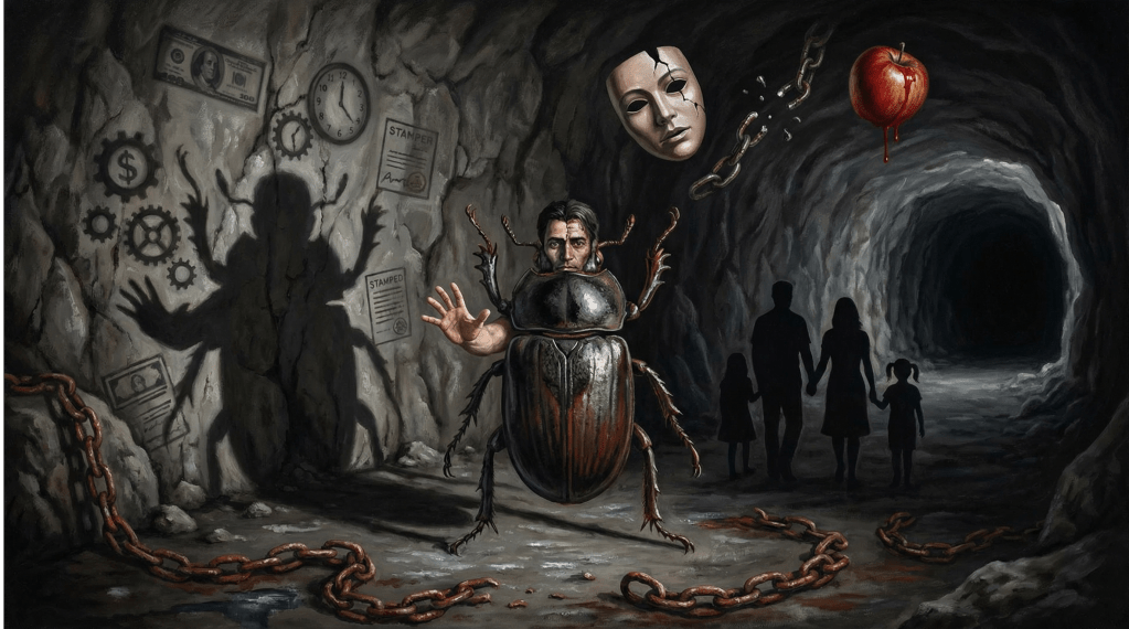 Na nossa caverna platônica, estamos acorrentados a sombras de valor: dinheiro, status, utilidade. Acreditamos que nossa identidade é definida por nosso trabalho, por nossa função social. Gregor Samsa é o prisioneiro que, de repente, se vê fisicamente transformado naquilo que ele já era simbolicamente: uma criatura desumanizada, cujo valor é medido apenas por sua utilidade. Quando ele perde essa utilidade, ele perde tudo.