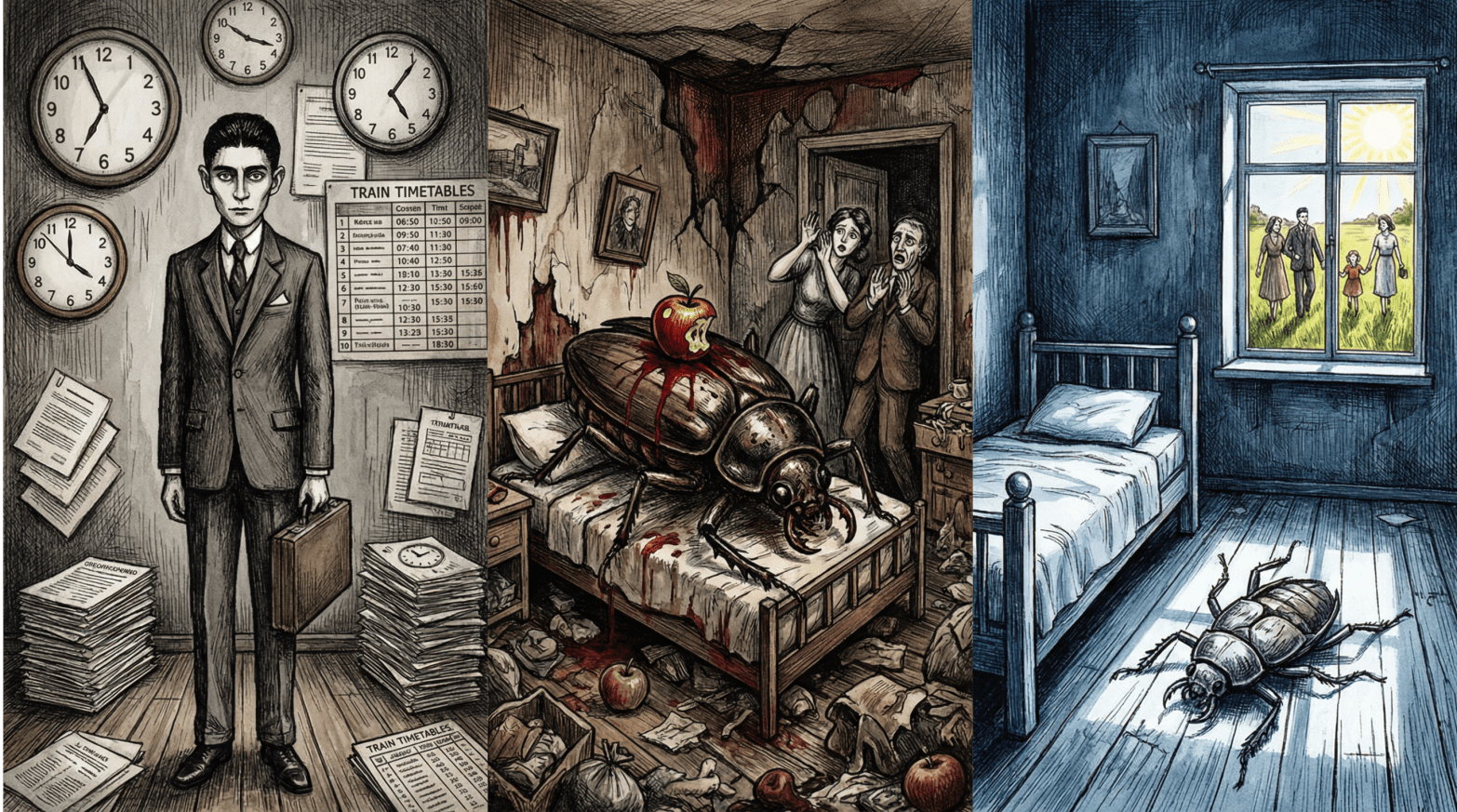 Assim começa a história. Sem explicação, sem motivo, sem justiça. A primeira reação de Gregor não é de horror existencial, mas de ansiedade prática: ele está atrasado para o trabalho. Um trabalho que odeia, como caixeiro-viajante, mas que mantém para sustentar sua família e pagar as dívidas de seu pai. Sua identidade, antes da metamorfose, já estava reduzida à sua função econômica.