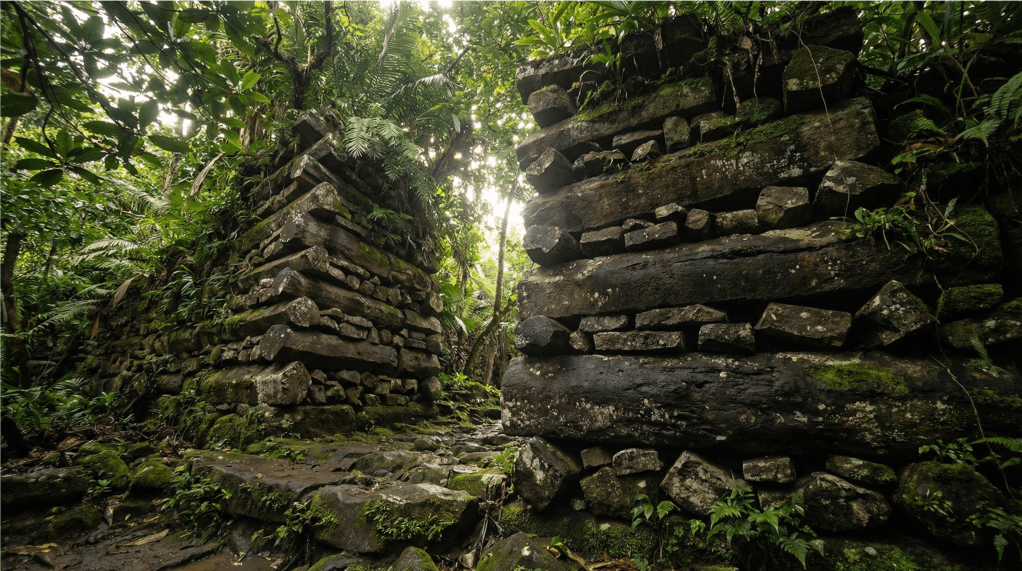 Imagine uma metrópole erguida com blocos colossais de basalto, alguns pesando mais de 50 toneladas, transportados de pedreiras do outro lado da ilha e meticulosamente empilhados para formar muralhas de até sete metros de altura. [3] Tudo isso foi realizado por uma civilização que, até onde sabemos, não possuía roldanas, alavancas ou qualquer tecnologia de metal para auxiliar em tal empreendimento monumental. A escala e a precisão da construção são tão desconcertantes que, para os habitantes locais, a única explicação plausível envolve magia e a ajuda de gigantes ou deuses. As lendas contam que os irmãos gêmeos Olisihpa e Olosohpa, feiticeiros de uma terra mítica, levitaram as pedras até o seu lugar com o poder do canto e da feitiçaria. [4]