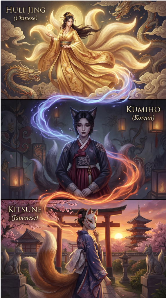 | Aspecto | Huli Jing (China) | Kumiho (Coreia) | Kitsune (Japão) |