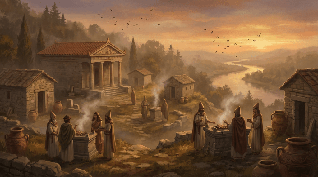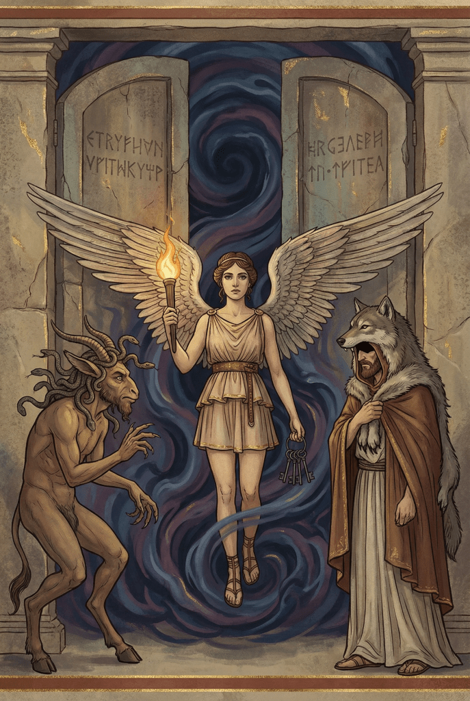 Os etruscos tinham uma relação profunda e reverente com a morte. Suas tumbas eram casas ricamente decoradas para a eternidade. Eles não precisavam de uma “Vatika” inventada; seus próprios deuses já eram a personificação perfeita do mistério e do terror do desconhecido.
